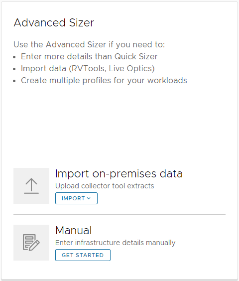 VMware Cloud Sizer에서는 기본적으로 아래 3가지 데이터 중 하나를 기반으로 용량 산정이 이루어집니다.