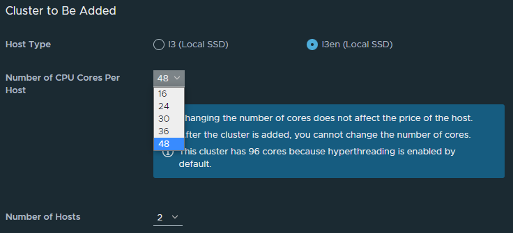 이러한 상황을 예방하기 위해서, VMware Cloud on AWS에서는 CPU의 코어를 조정하여 배포할 수 있습니다.