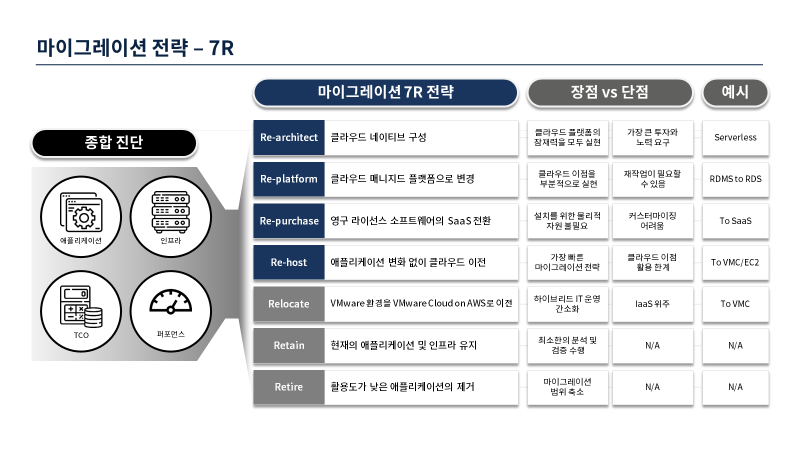 일반적으로 제시되는 마이그레이션 전략(7R) 중 VMware Cloud on AWS는 Relocate와 Rehost에 해당합니다.