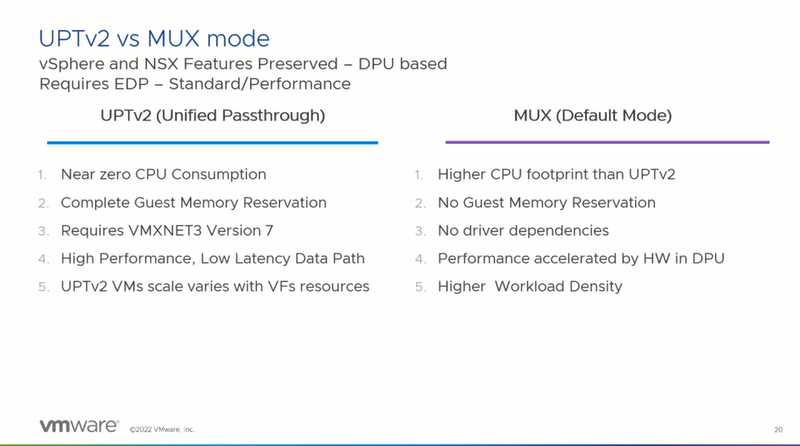 DPU 기반 가속화 이후 x86 CPU에서의 동작하는 ESXi의 데이터 처리 방식에 따라 2가지 모드를 제공합니다.