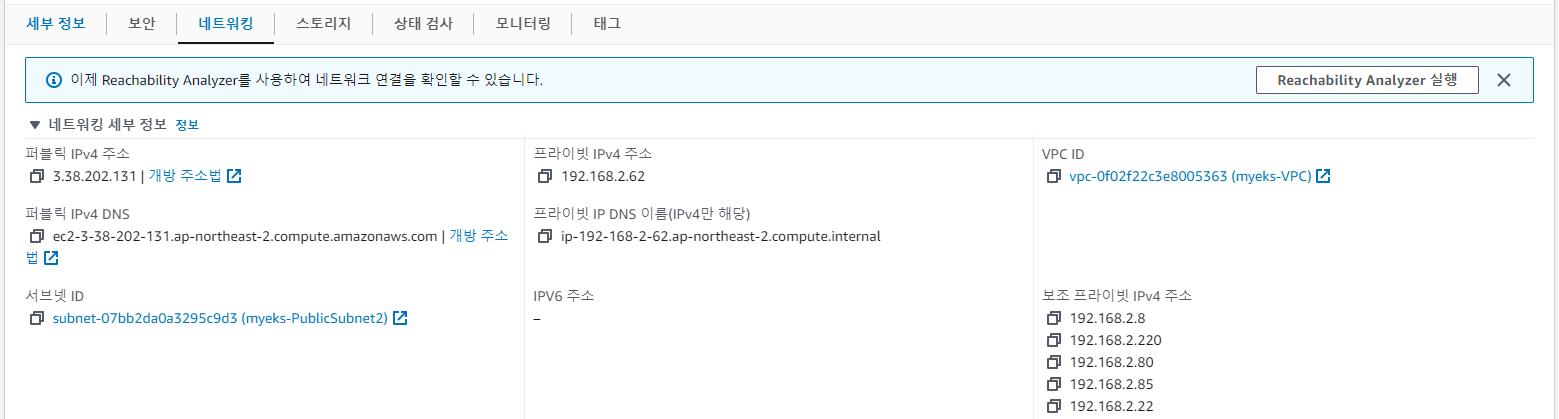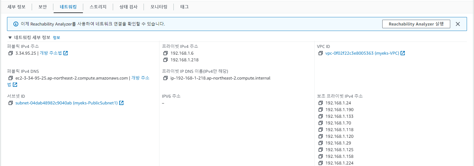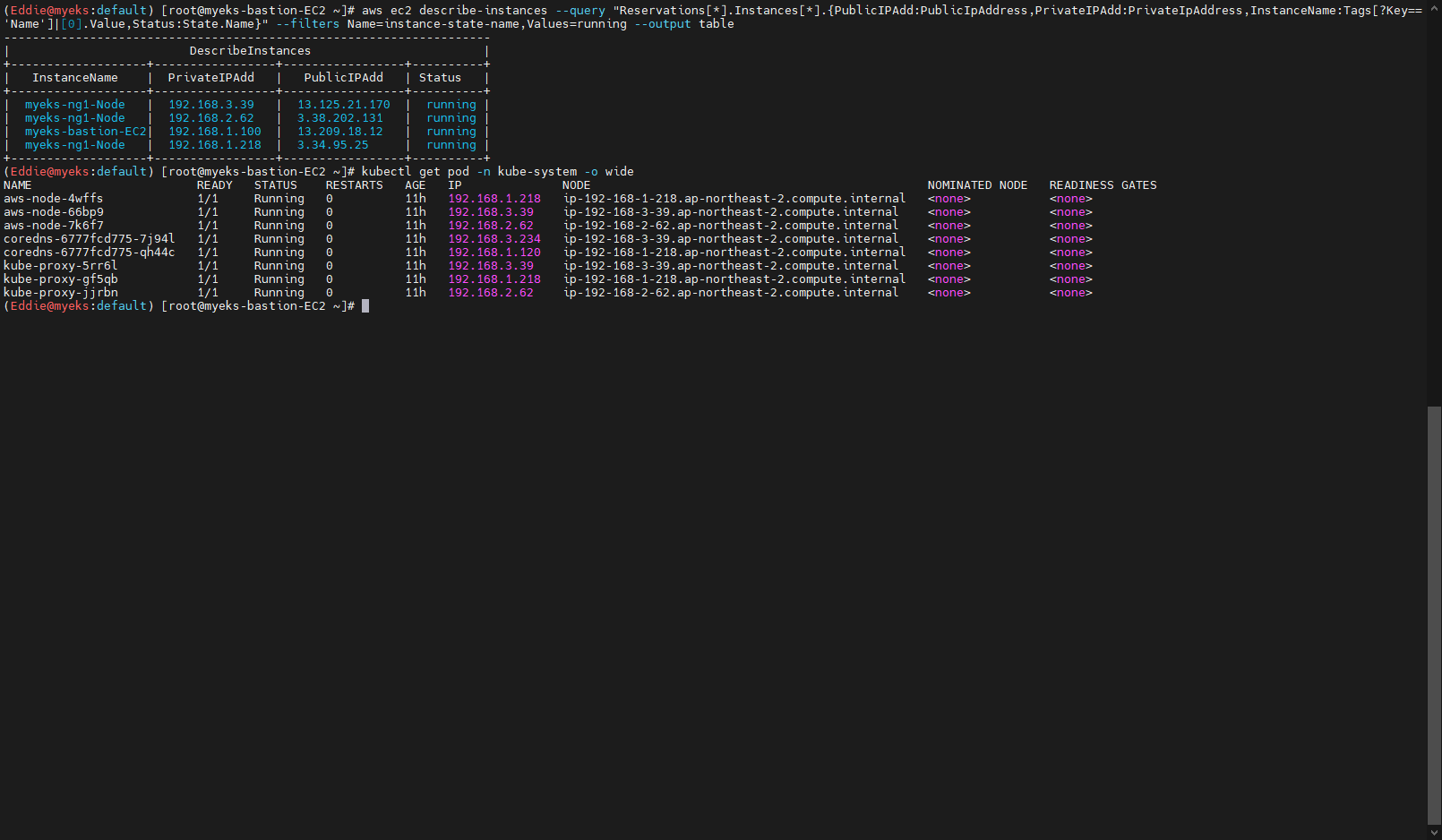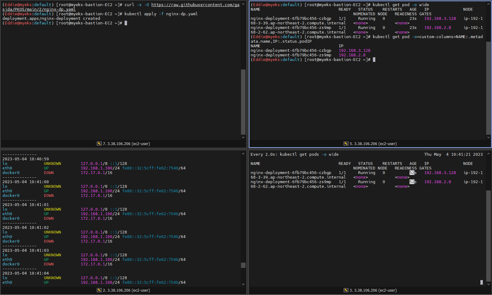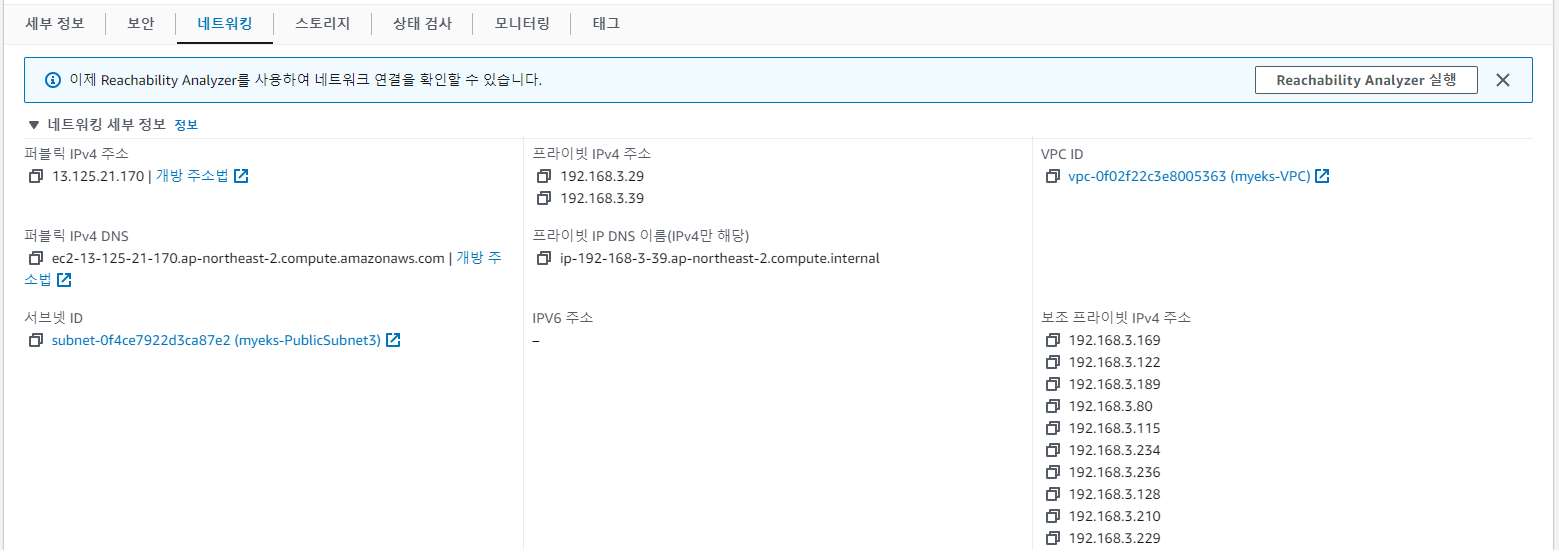 - pod의 IP와 pod 내 위치한 kube-system용 pod(aws-node, kube-proxy)가 pod와 동일한 IP를 보유