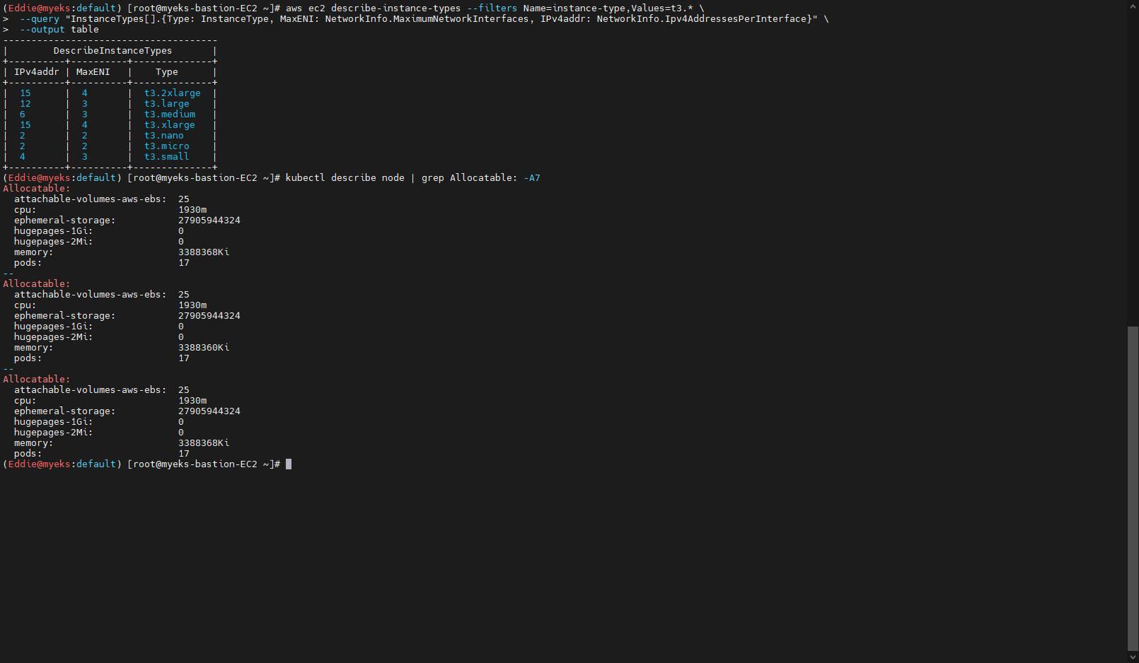 - 인스턴스의 ENI 수량 및 IP 수량, 최대 할당가능 pod 수량 확인 : t3.medium