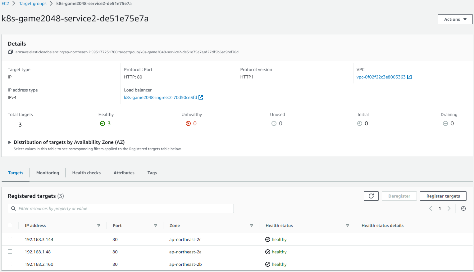 - 실제 생성된 ALB를 확인 및 Target Group의 대상 pod 정상 등록 여부 확인