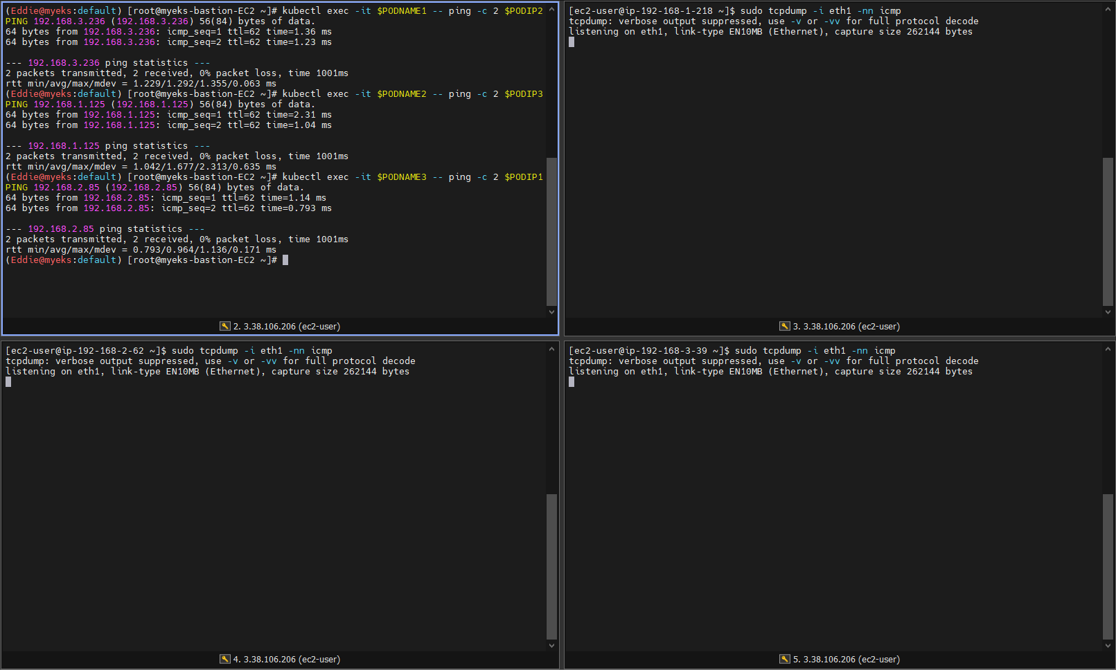 - pod 간 ping을 수행시 ENI를 통해 pod의 IP를 가지고 패킷이 직접 통신됨을 확인