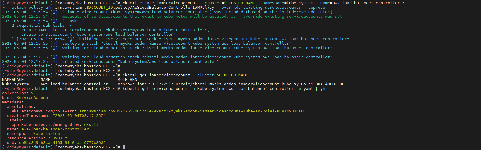 - OIDC 확인, IAM policy 생성, AWS Loab Balancer Controller를 위한 ServiceAccount 생성 및 확인