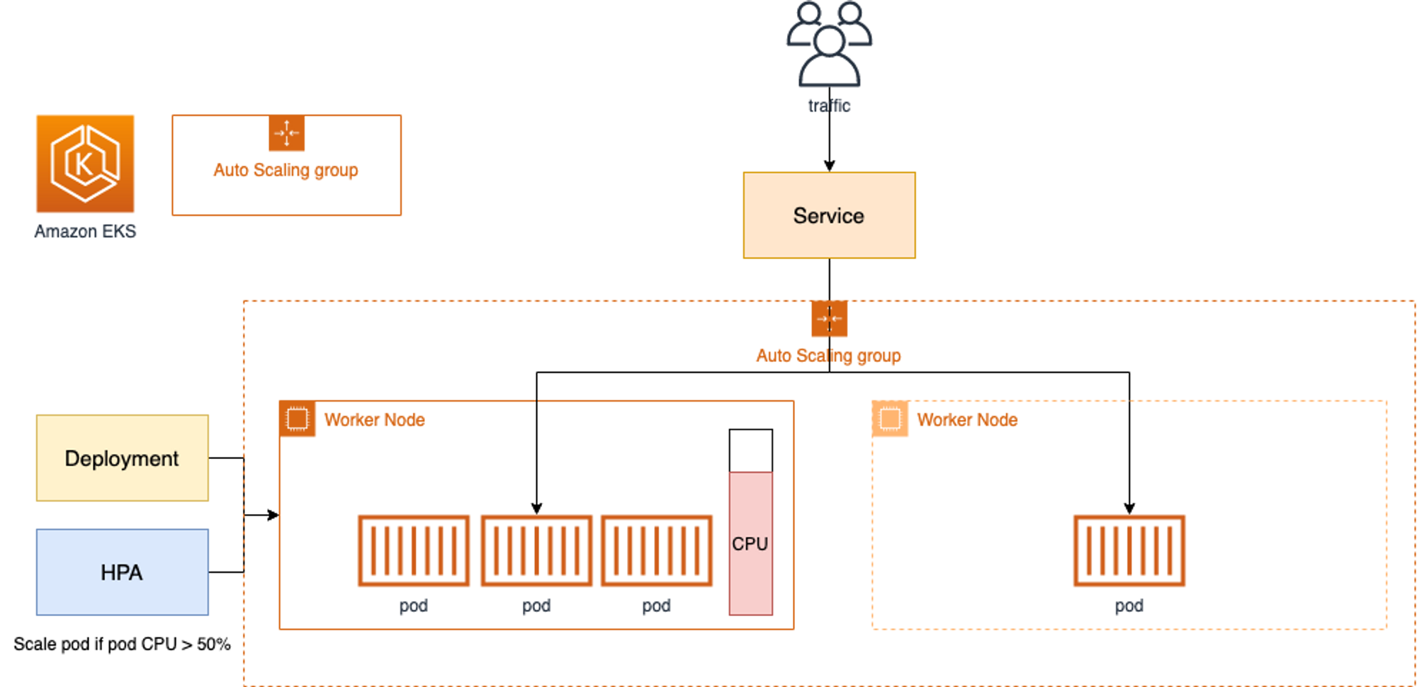 EKS에서는 Pod의 수량을 조정하는 Horizontal Pod Autoscaling(HPA)와