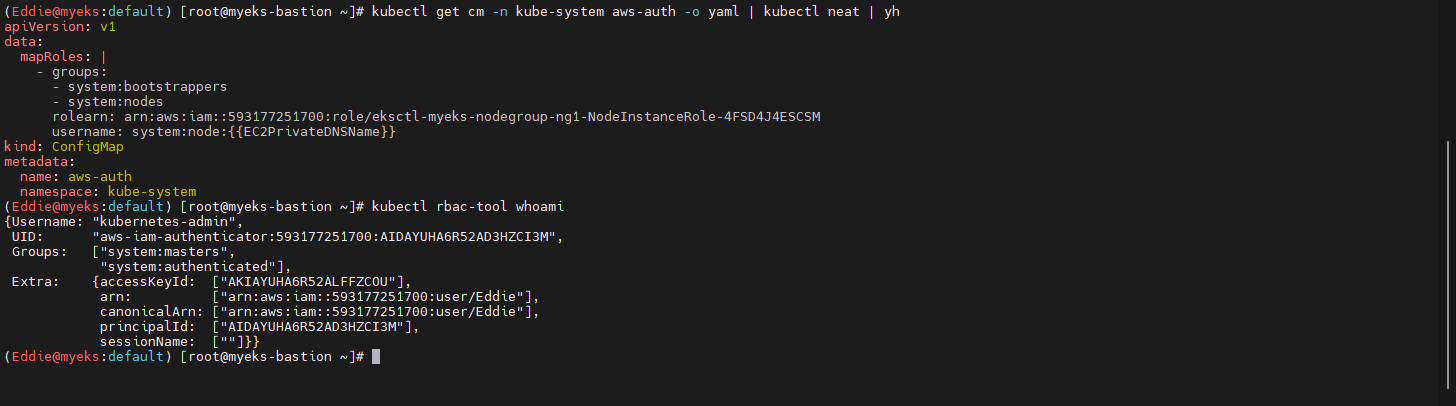 - k8s 내부 인증을 통한 RBAC 처리 : IAM User/Role이 확인되면 AWS-Auth configmap에서 mapping 정보 확인