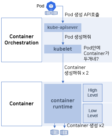 그 결과 컨테이너 런타임은 1단계와 2단계가 함께 포함된 high level Container runtime과
