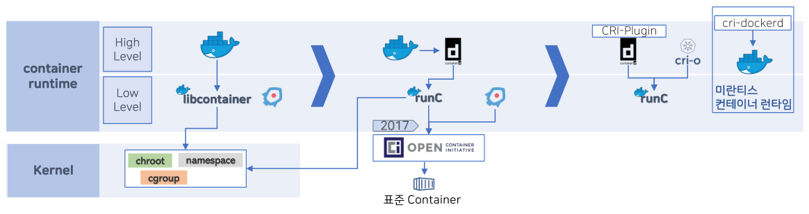이후 시간이 지나면서 docker에서 containerd가 분리가 되었고, 새로운 컨테이너 런타임이 등장할 때마다,