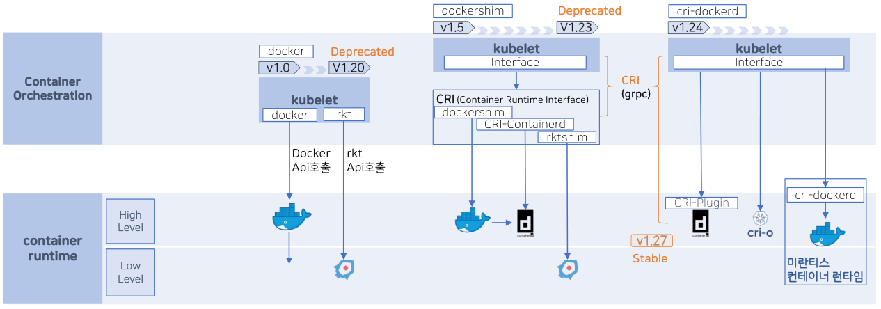 kubelet에 새로운 컨테이너 런타임에 대한 정의와 API가 추가되어야 했습니다.