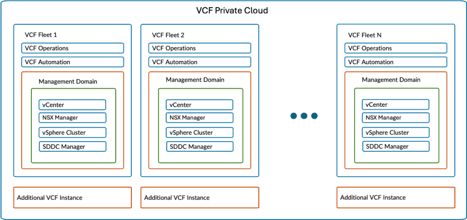 VCF Fleet | VCF Operations 및 Automation으로 관리되는 환경 | 하나의 VCF Operations 하나의 VCF Automation 하나 이상의 VCF Instance |