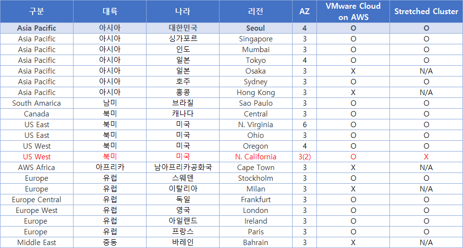 AWS의 리전별 VMware Cloud on AWS 서비스 현황을 정리해 보았습니다.