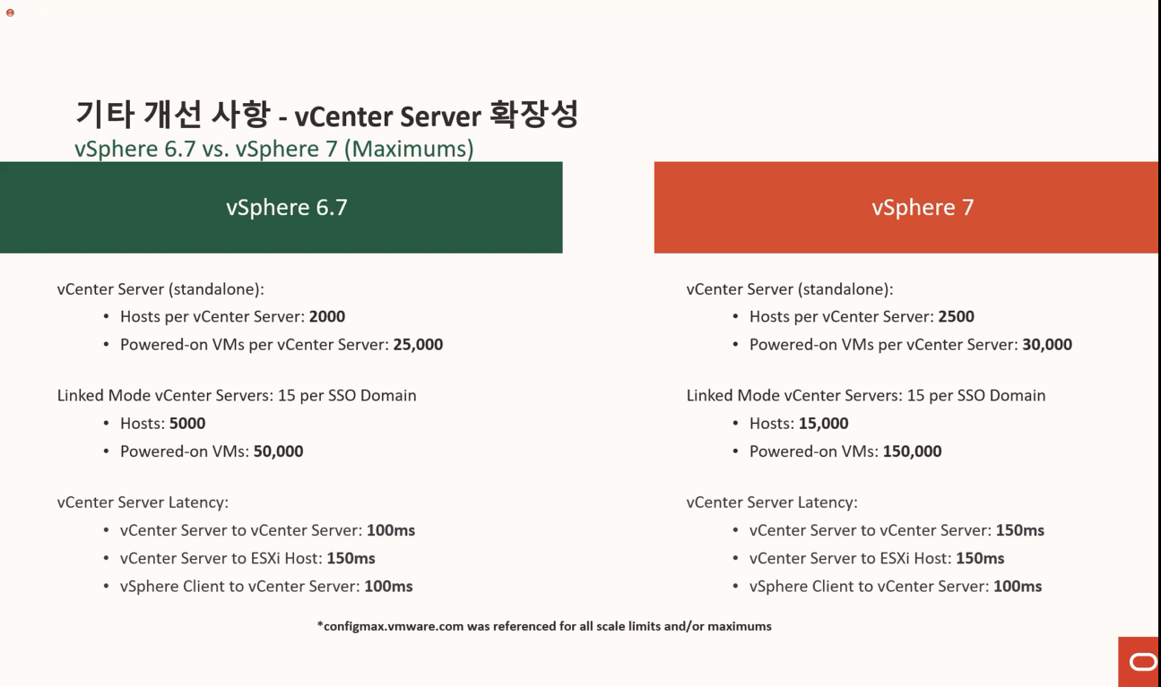 기존 vSphere가 v6.7에서 v7.0으로 업그레이드 되면서, 최대값이 일부 향상되었습니다.