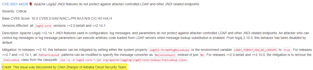 이후 12월 10일 아침에 GitHub Advisory Database를 통해 CVE-2021-44228 취약점이 공식 게재되었으며,