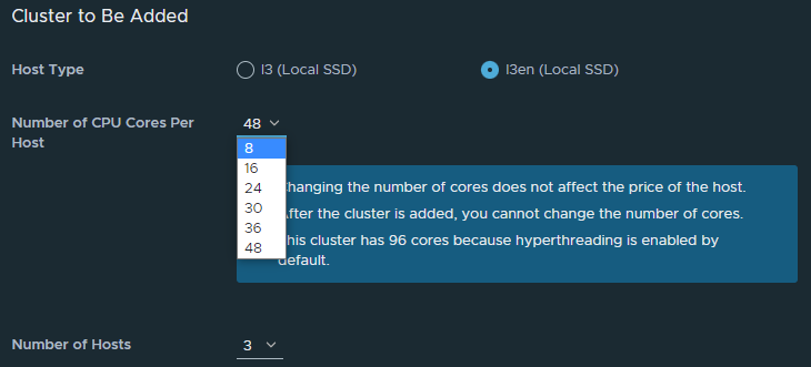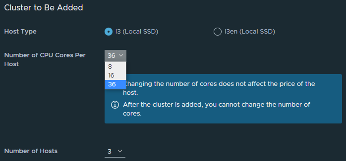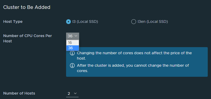 - SDDC 내 첫번째 클러스터의 Core 수량은 변경할 수 없습니다.