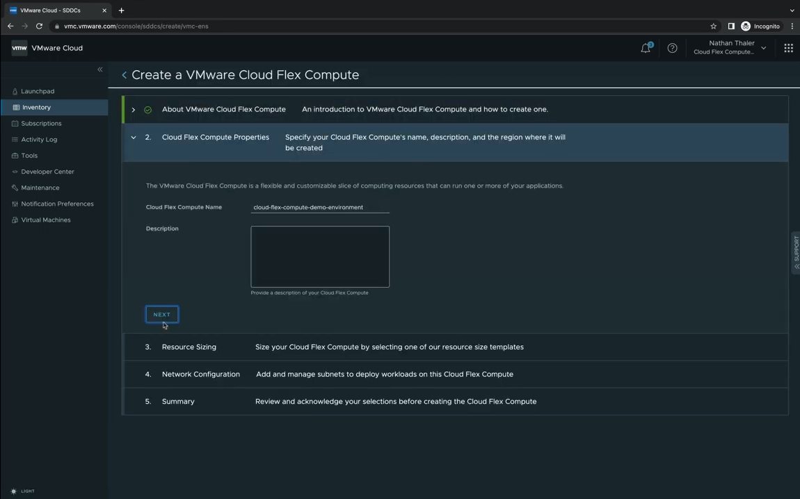 그 다음 Cloud Flex Compute를 구분하기 위한 이름과 설명을 입력하고 'NEXT'를 선택합니다.