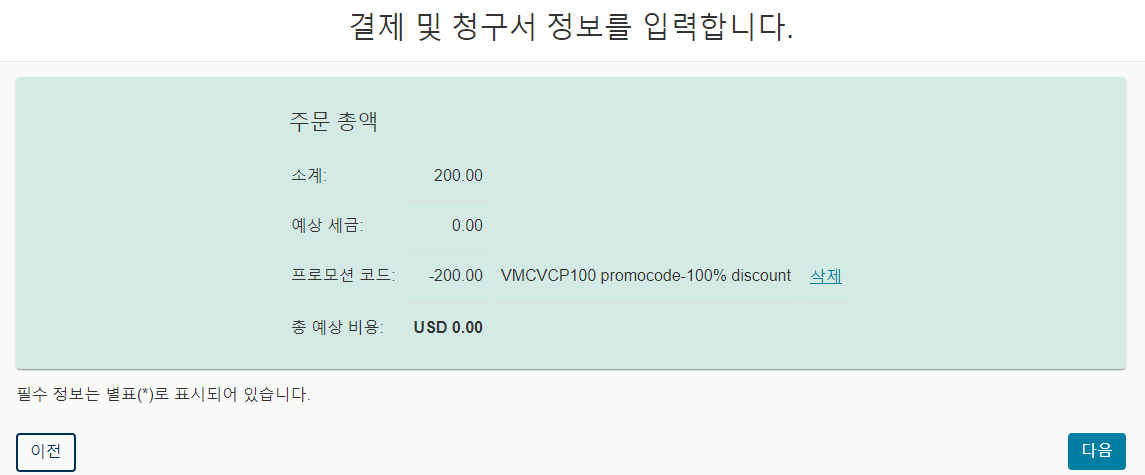 Pearson Vue에서 시험 접수 마지막 단계에서 쿠폰코드 'VMCVCP100'을 입력하면 시험비를 할인 받을 수 있습니다.