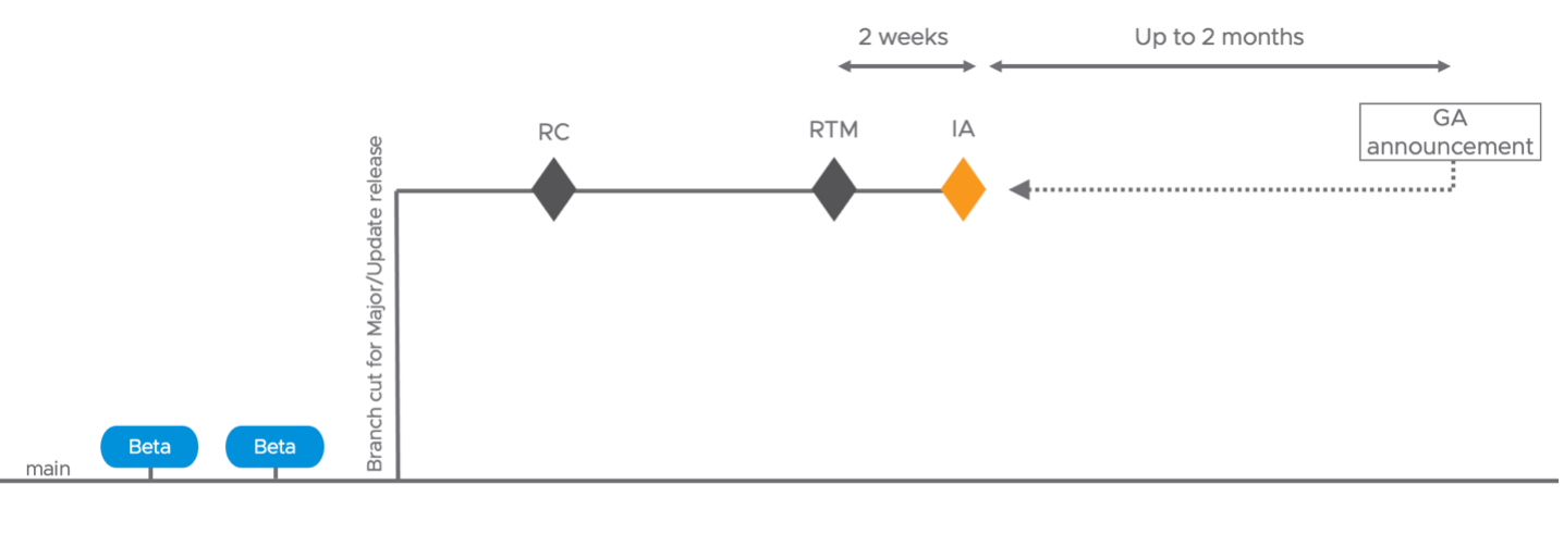 RTM 2주 후 IA를 출시하고, 이후 약 4~6 주 후(최대 2개월) GA를 발표하는 과정을 보여주고 있습니다.