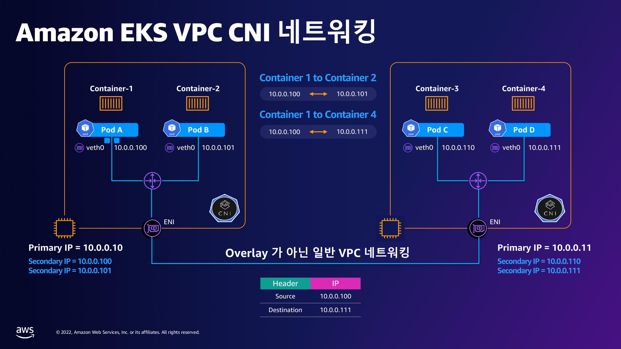 EKS에서는 이러한 단점들을 극복하기 위해 전용의 AWS VPC CNI를 사용합니다.