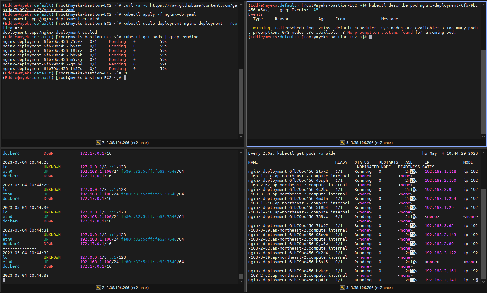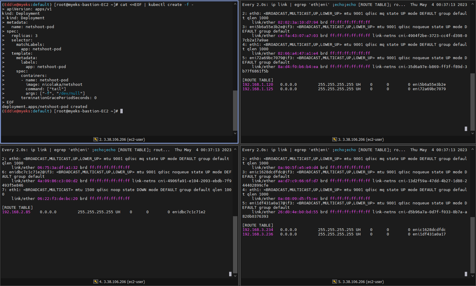 - 대량의 pod 생성시 자동으로 ENI가 추가되면서 IP 할당