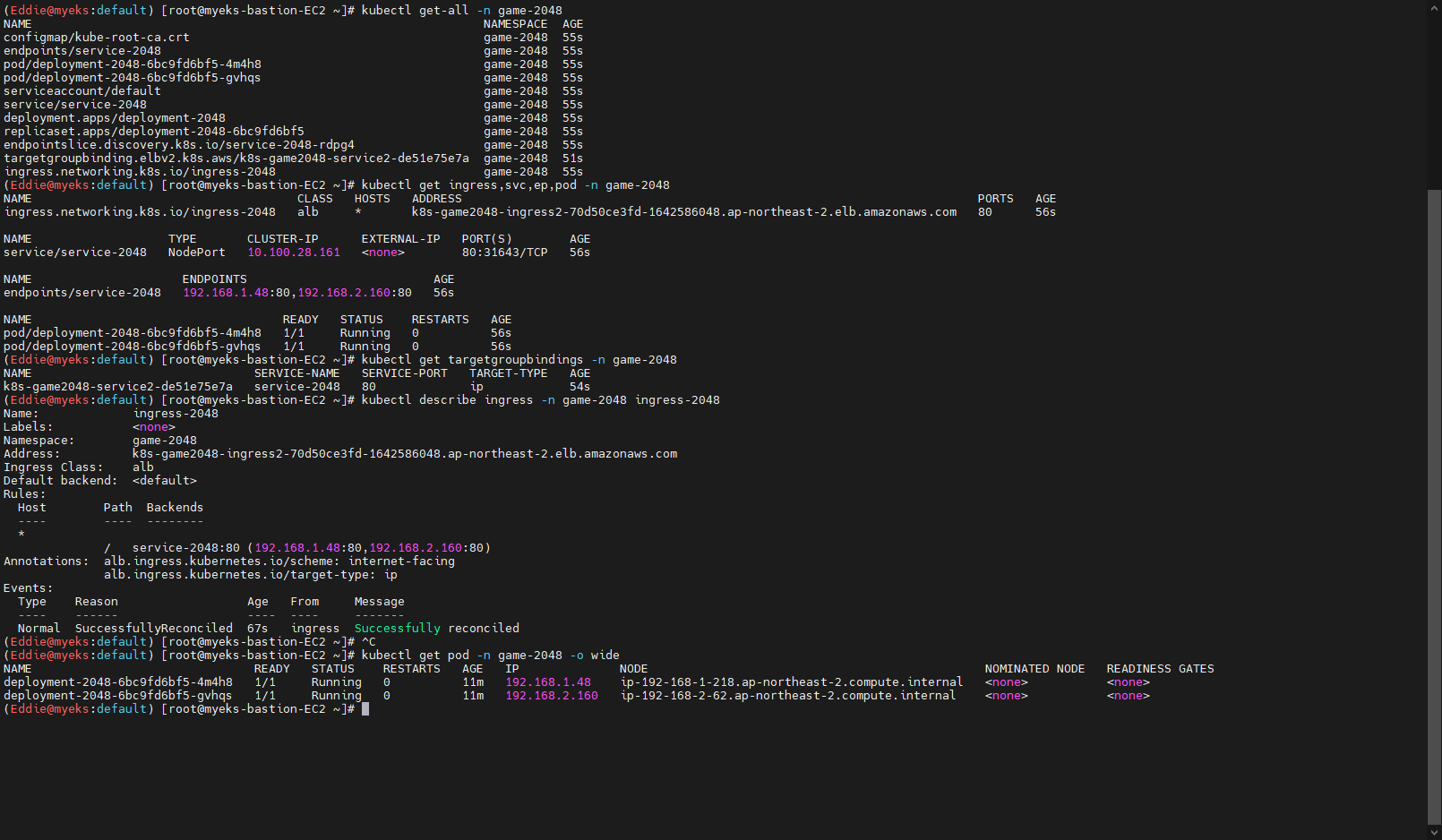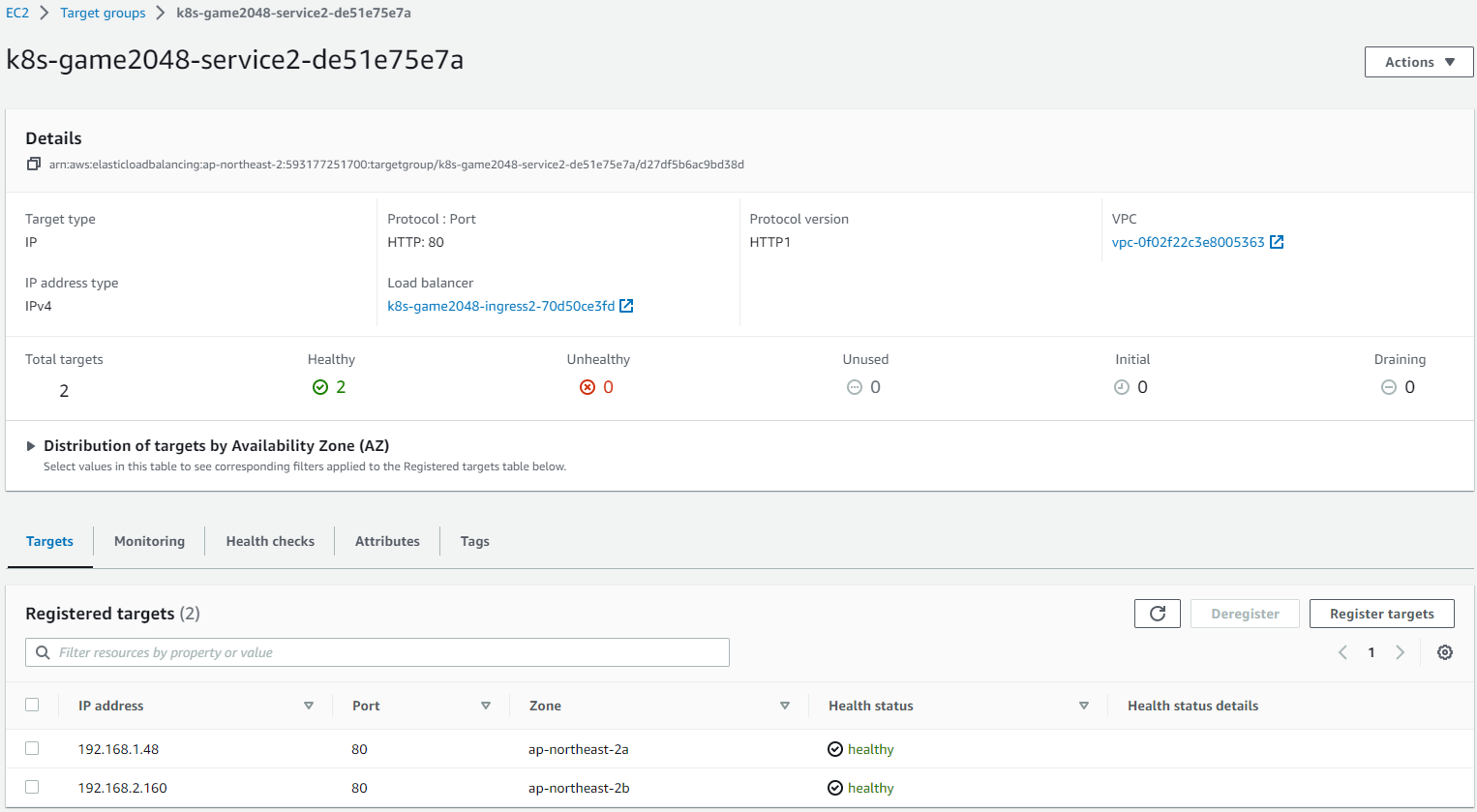 - 실제 생성된 ALB를 확인 및 Target Group의 대상 pod 정상 등록 여부 확인