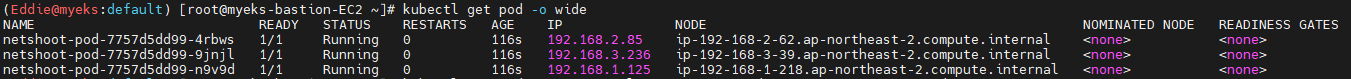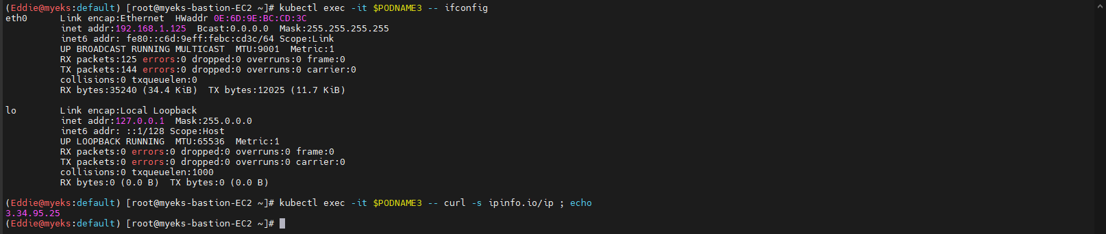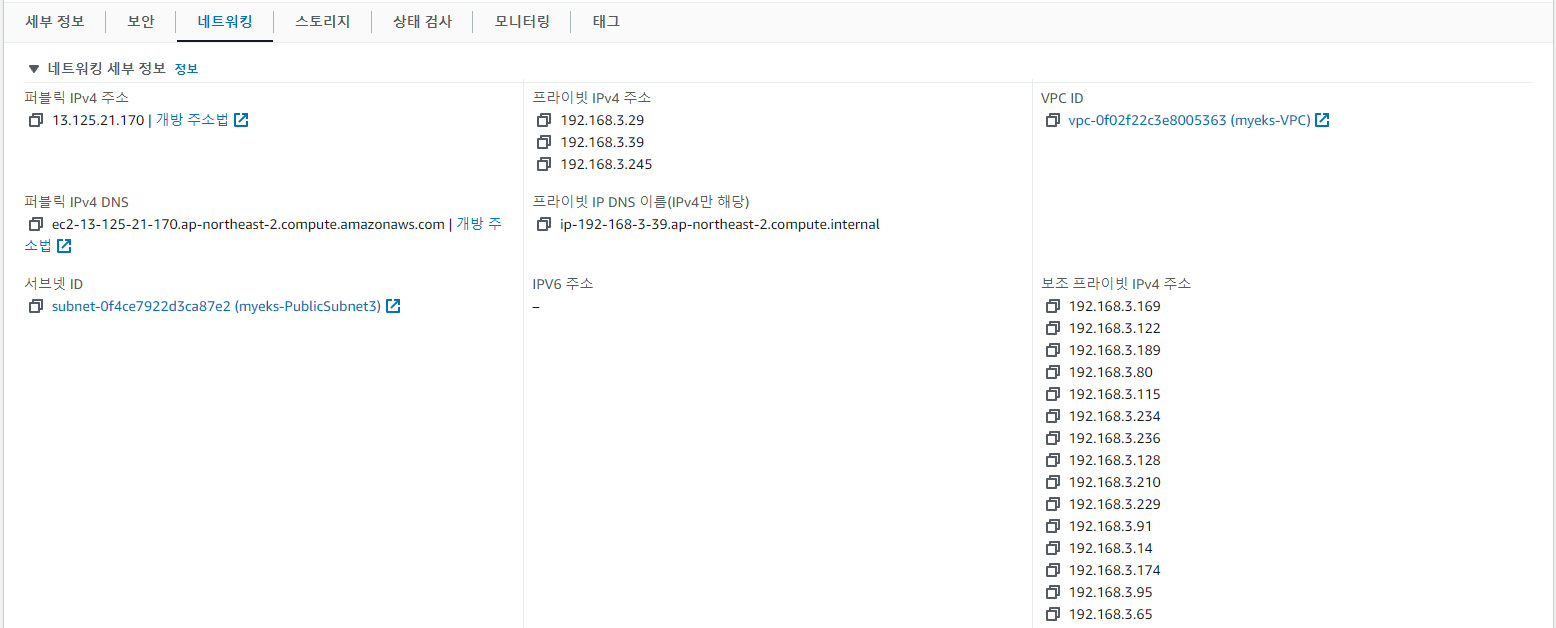 - pod의 IP와 pod 내 위치한 kube-system용 pod(aws-node, kube-proxy)가 pod와 동일한 IP를 보유