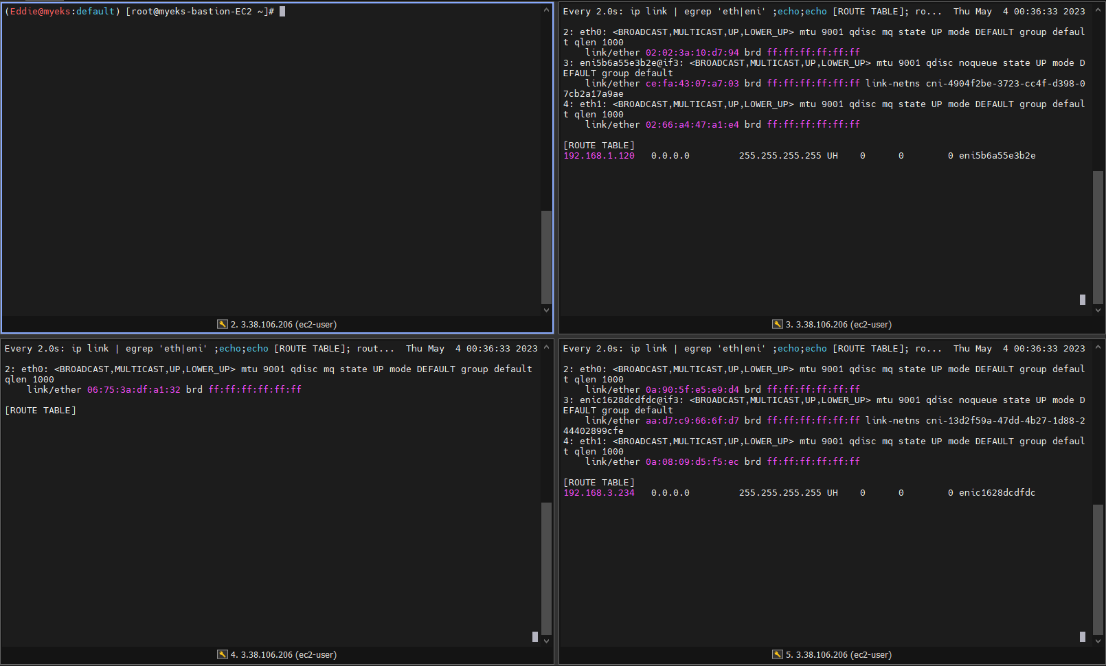 - pod 간 ping을 수행시 ENI를 통해 pod의 IP를 가지고 패킷이 직접 통신됨을 확인