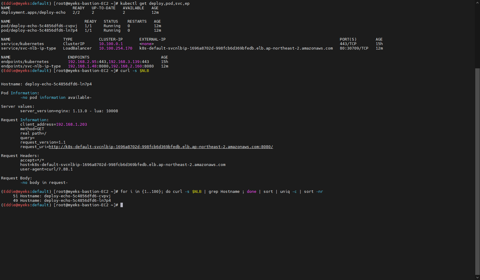 - 100회 접속 시도시 NLB를 통한 부하분산 확인