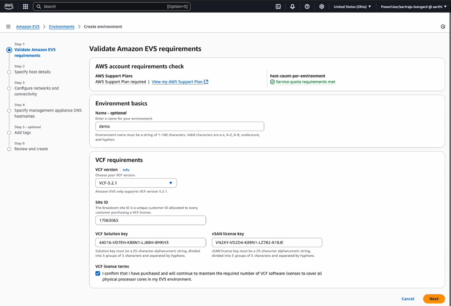 입력이 완료되었으면, VCF license terms에 대한 확인 후 Next를 선택해 다음단계를 진행합니다.