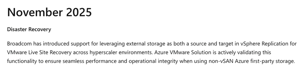 그런데 이번 달부터 AVS의 외장 스토리지를 vLSR의 타겟 스토리지로 사용할 수 있다는 공지가 발표되었습니다.