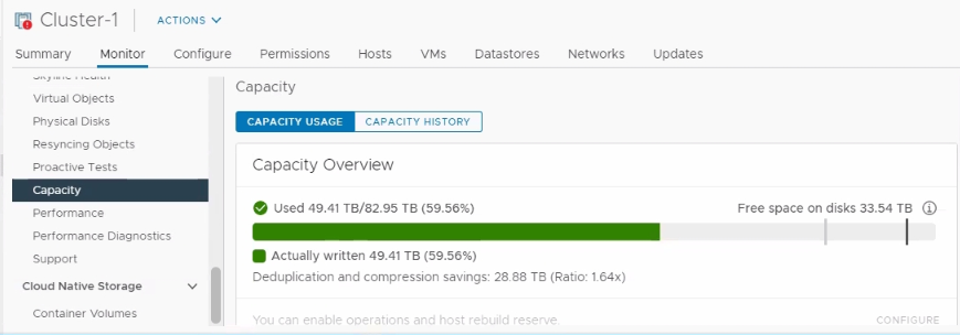 물리 디스크 사용량은 49.41TB지만, 중복제거와 압축을 통해 28.88TB의 데이터를 절감하였습니다.