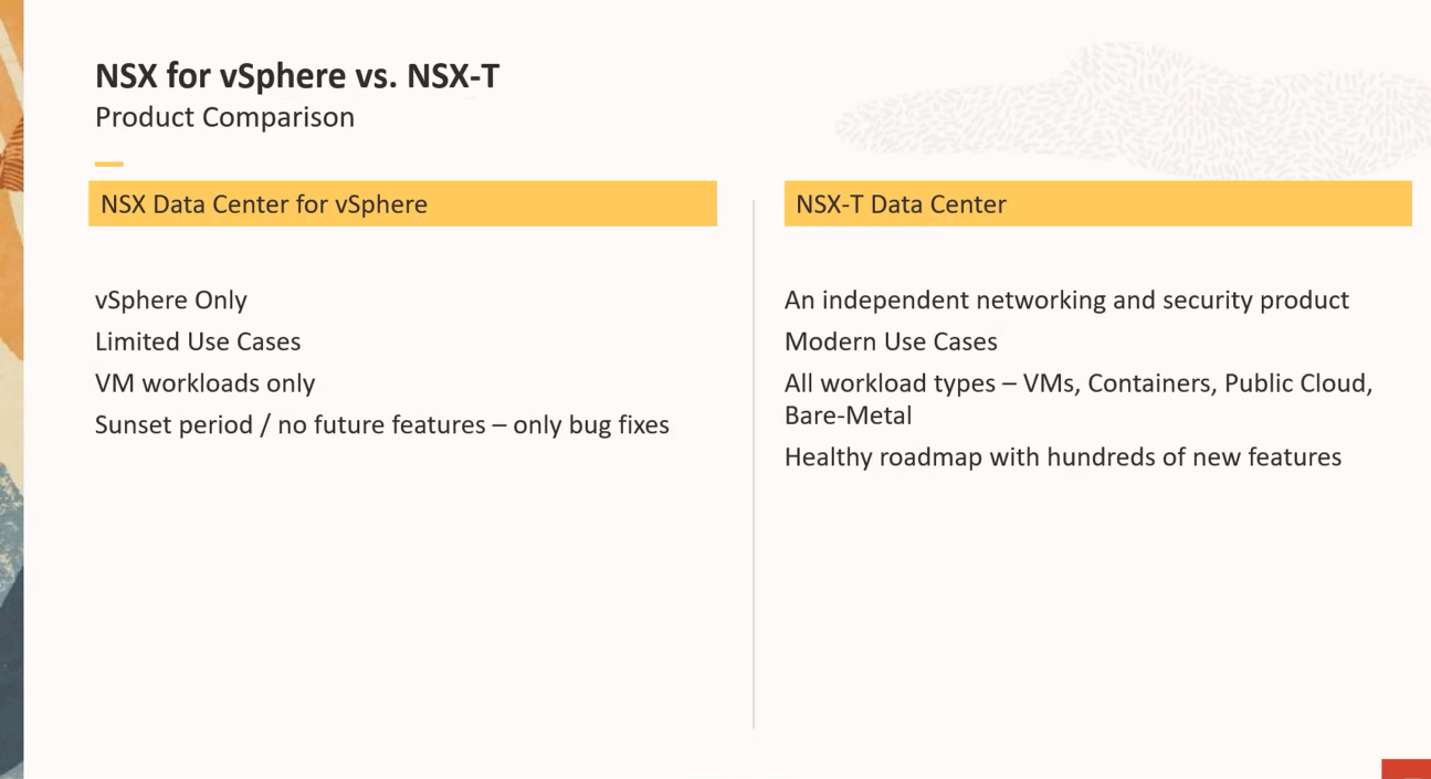 NSX-V는 구버전으로 2022년에 모두 EOGS 예정이며, 최근 구성은 NSX-T로 진행되고 있습니다.