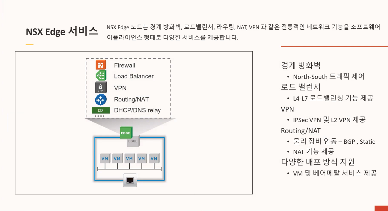 로드밸런서, VPN, NAT, DHCP, DNS 관련 기능들도 모두 Edge 가상머신을 통해서 지원합니다.