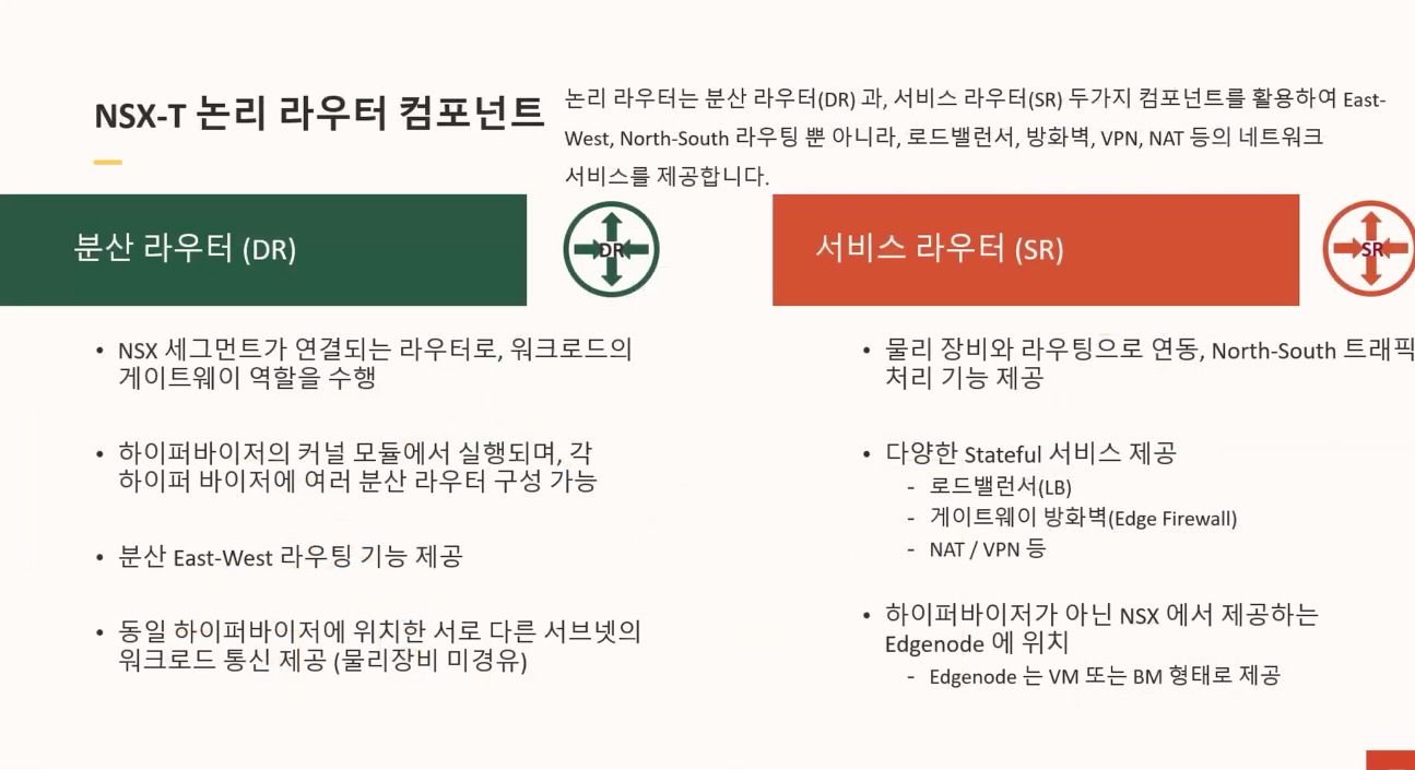 NSX-T의 라우터 기능의 경우 목적에 따라 분산라우터 또는 서비스라우터 형태로 구성되며,