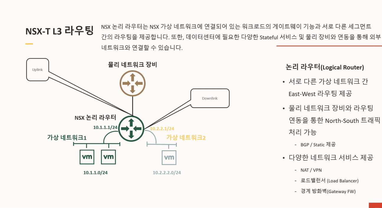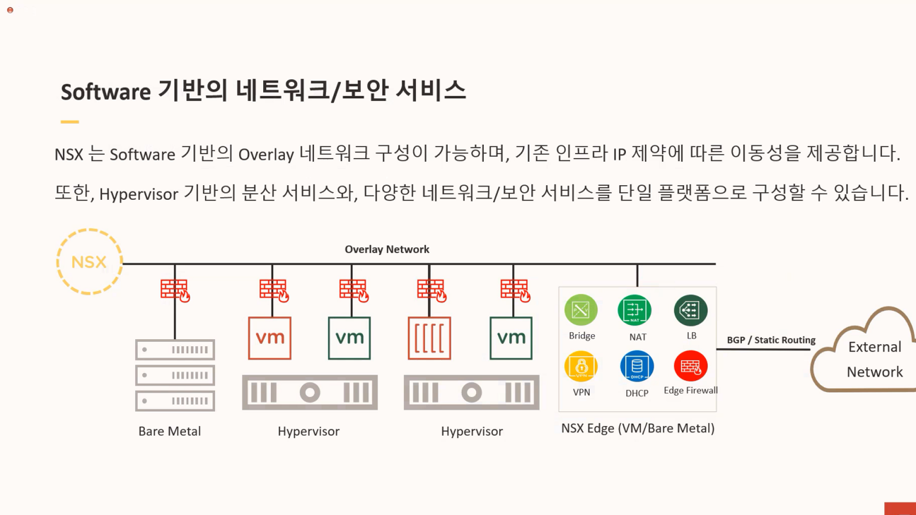 기본적인 L2 스위칭, L3 라우팅뿐만 아니라, 로드밸런서나 방화벽, NAT, VPN 같은 기능도 NSX를 통해 제공합니다.
